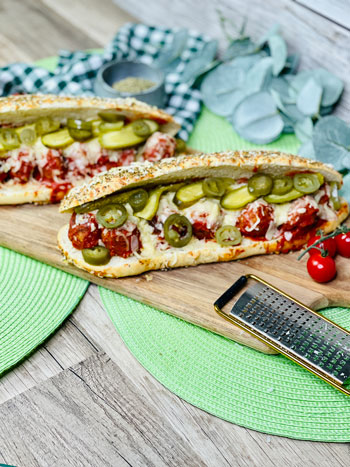 - Das Baguette für 5 Minuten ca. 180 Grad in den Backofen geben und den Käse schmelzen.
