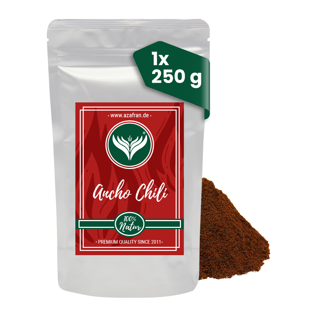Unser Ancho Chilipulver stammt aus Mexiko und gehört zu den milderen Chilisorten. Es erreicht einen Schärfegrad von 4/10. Die Schärfe ist hierbei also relativ gering aber diese Chili zeichnet sich durch ihr besonderes Aroma aus. Beim Ancho Chili handelt es sich um den sehr fein gemahlenen, getrockneten Poblano-Chili, der für seinen fruchtigen, leicht rauchigen und schokoladigen Geschmack sowie das einzigartige Aroma bekannt ist.