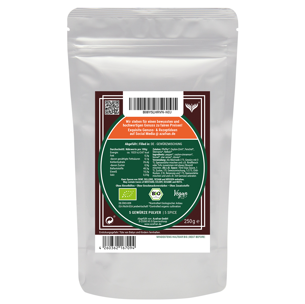Bei unserem BIO 5 Gewürze Pulver handelt es sich um eine typisch chinesische / asiatische Gewürzmischung aus hochwertigen BIO Zutaten.
