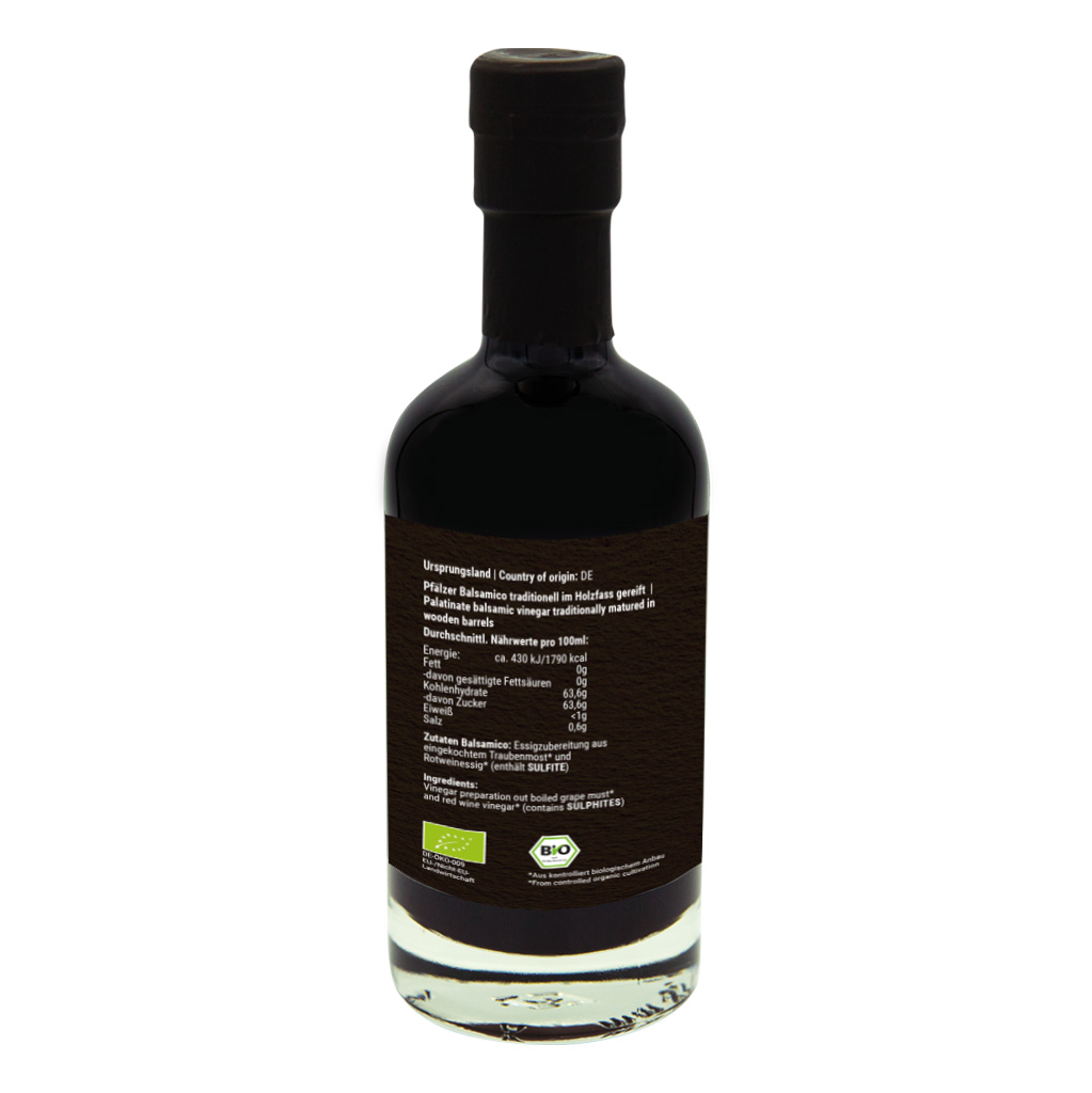Der BIO-Balsamico stammt aus kontrolliert biologischem Anbau in Deutschland (Pfalz), welches bis heute sehr bekannt für seine guten Weine ist. Wir haben uns bewußt gegen einen „Original" Balsamico di Modena (Herkunftsgeschütze Bezeichnung für Original Balsamico aus Italien) entschieden und haben stattdessen in Zusammenarbeit mit einem deutschen Essig-Experten einen eigenen Balsamico „Made in Germany" in BIO-Qualität entwickelt.