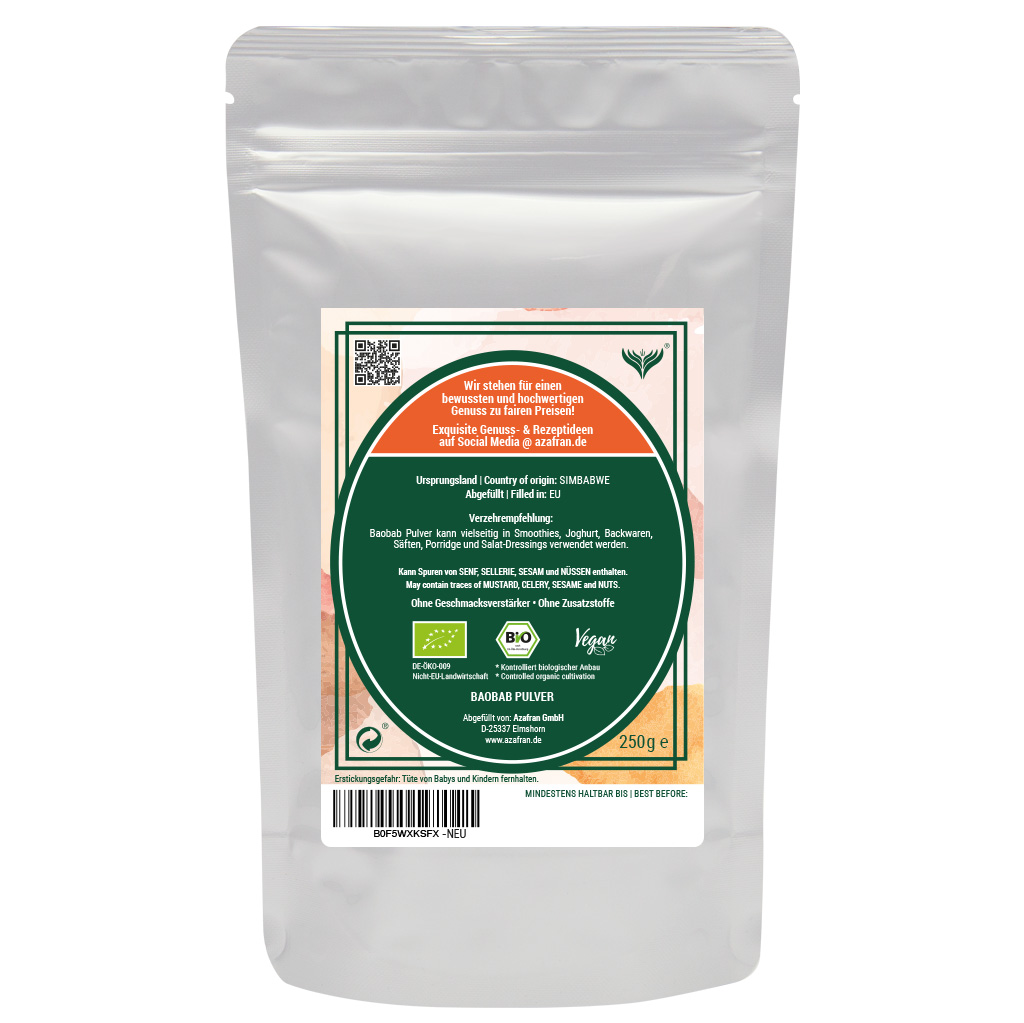 Baobab gemahlen im wiederverschließbaren Aromabeutel (à 250 Gramm) verpackt (Versandkostenfrei innerhalb von Deutschland geliefert).