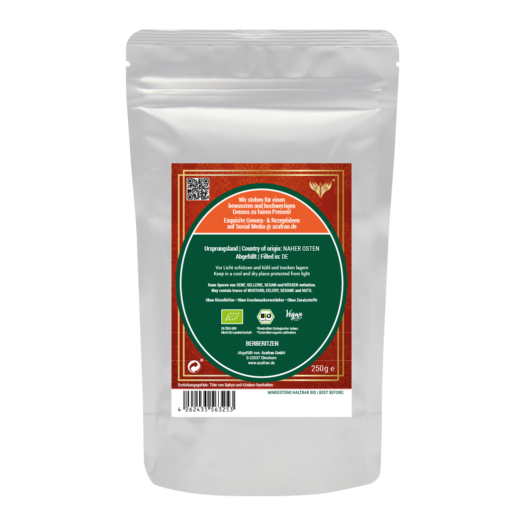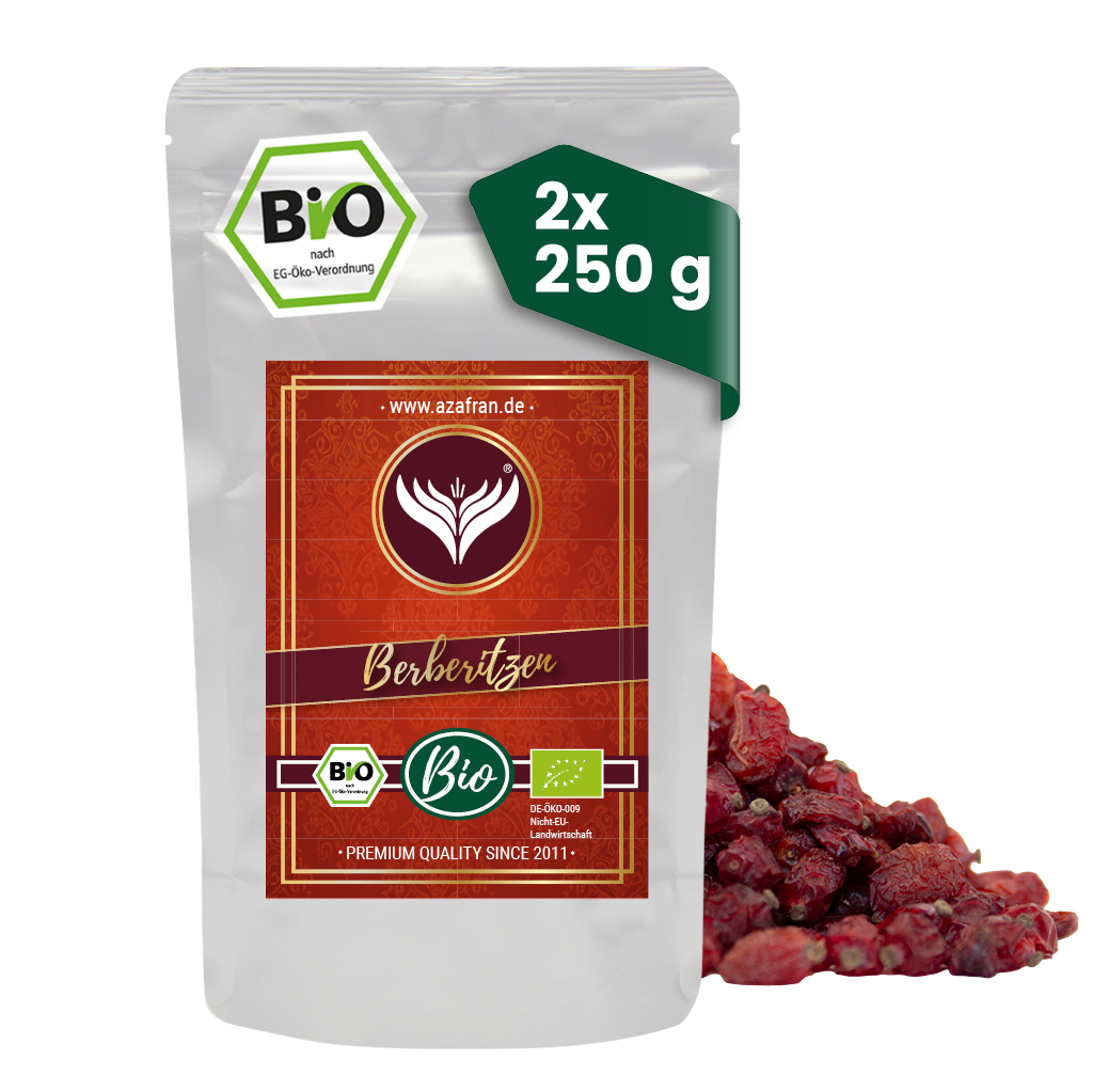 Azafran BIO Berberitzen (Berberis Vulgaris) stammen aus kontrolliert biologischem Anbau aus dem Iran und dem Nahen Osten (Nicht EU-Landwirtschaft). Die kleinen, dunkelroten bis rotbraunen Beeren werden schonend getrocknet und in Rohkostqualität verarbeitet – für beste Qualität und vollen Geschmack. Die getrockneten Früchte besitzen eine weiche bis bissfeste Konsistenz und überzeugen mit ihrem intensiv fruchtig-säuerlichen Aroma, das sich zugleich durch eine leichte Süße sowie eine fein-herbe Note auszeichnet.