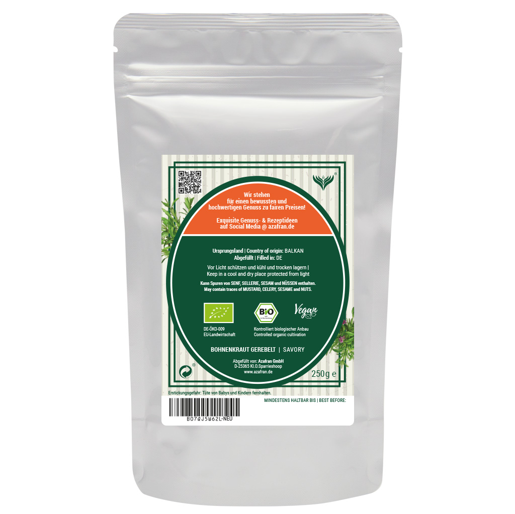 Unser Bohnenkraut stammt aus kontrolliert ökologischem Anbau im Balkan. Es zeichnet sich durch seinen einzigartigen, aber auch aromatisch charakteristischen pfefferähnlichen Geschmack aus, was es zu einem der beliebtesten Kräuter in der französischen Küche macht.