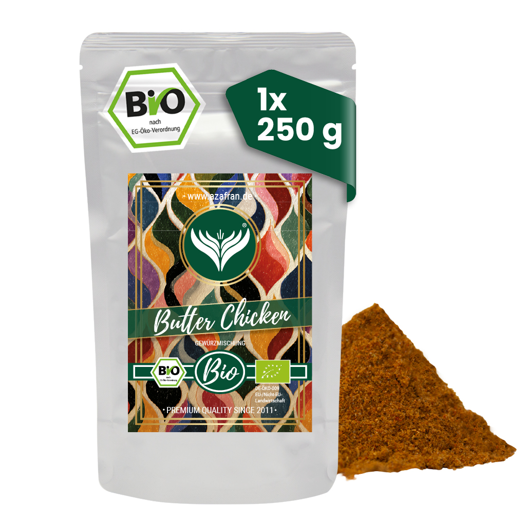 BIO Butter Chicken Gewürzmischung im wiederverschließbaren Aromabeutel (à 250 Gramm) verpackt (versandkostenfrei innerhalb von Deutschland geliefert).