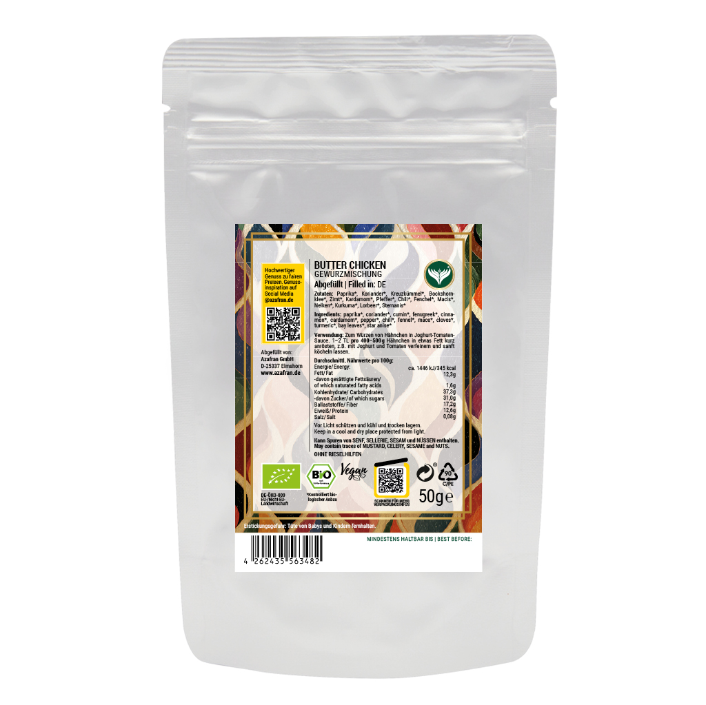 Bei unserer Butter Chicken Gewürzmischung handelt es sich um eine sorgfältig komponierte Gewürzzubereitung nach hauseigener Rezeptur aus hochwertigen BIO Zutaten. Die harmonische Mischung aus aromatischen Gewürzen wie Paprika, Koriander, Kreuzkümmel und Bockshornklee mit wärmenden Noten von Zimt, Kardamom und Nelken verleiht Ihrem Butter Chicken den unverwechselbar cremig-würzigen Geschmack, für den dieses nordindische Gericht weltweit geliebt wird.