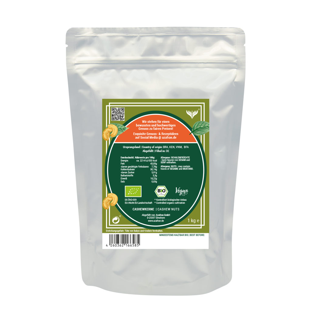 BIO Cashewkerne ganz im Aromabeutel (à 1kg) verpackt (Versandkostenfrei innerhalb von Deutschland geliefert).