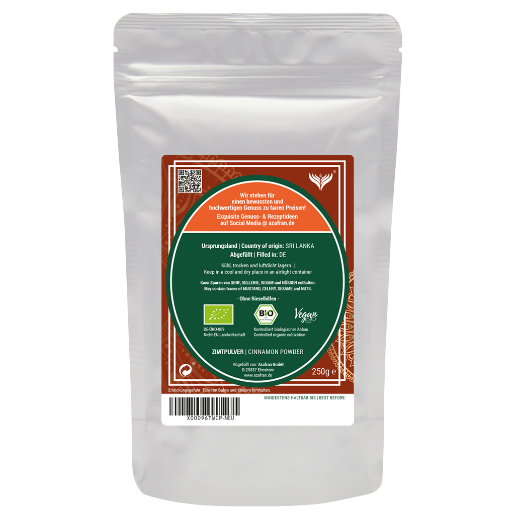 Unser Ceylon-Zimt stammt aus Sri Lanka und gehört zu den edelsten Zimtarten der Welt. Das Zimtpulver zeichnet sich durch sein intensives Aroma und seine geringen Cumarin Werten aus. Nur der echte Ceylon-Zimt gilt im Zusammenhang mit den geringen Cumarin-Werten als gesundheitlich unbedenklich.