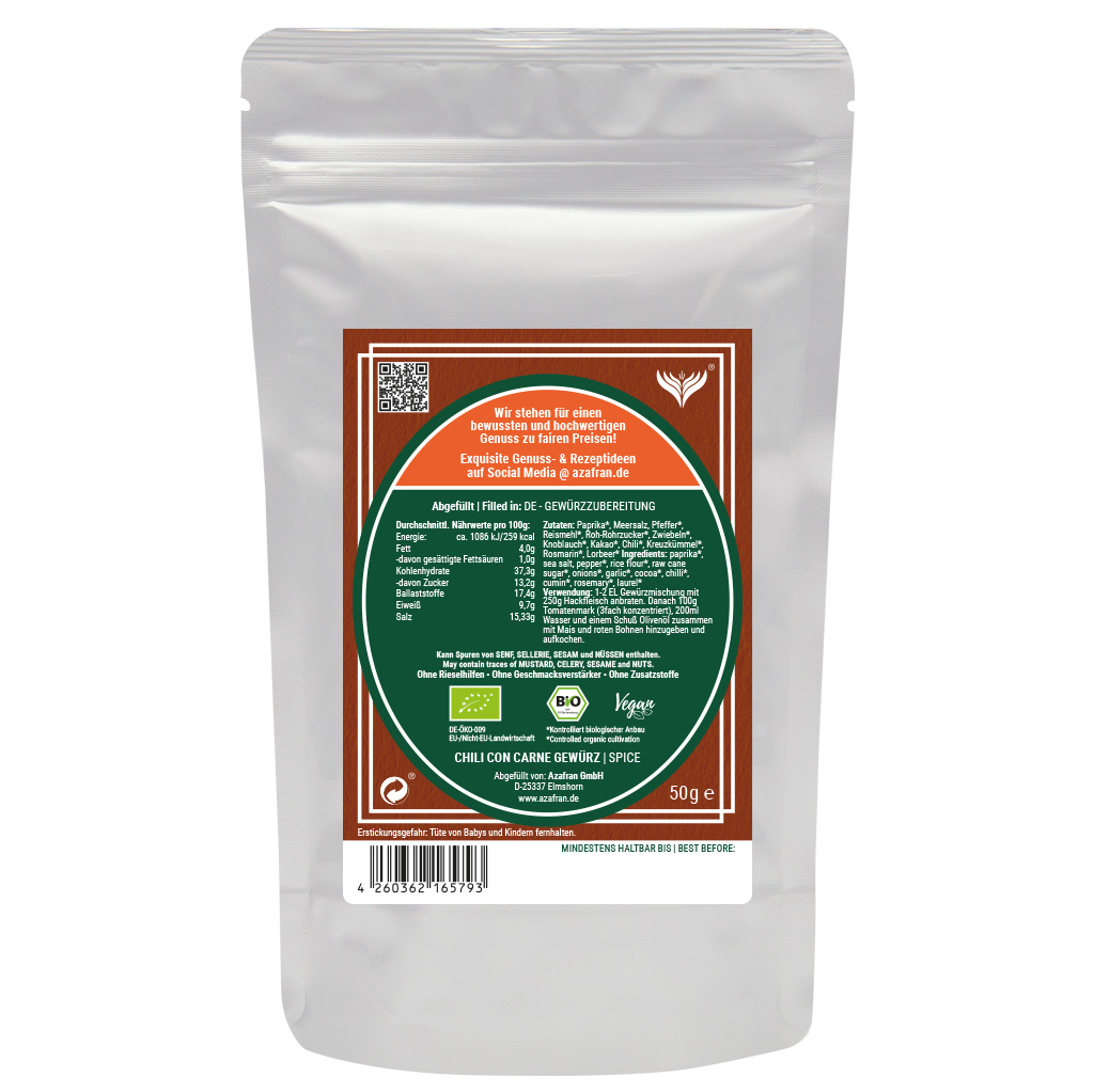 BIO Chili con Carne Gewürzzubereitung im Aromabeutel (à 50 Gramm) verpackt (Versandkostenfrei innerhalb von Deutschland geliefert).