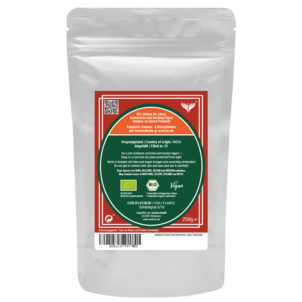 Unsere Chiliflocken stammen aus kontrolliert ökologischem Anbau aus unterschiedlichen Herkunftsgebieten, wie Indien und / oder Nigeria. Er zeichnet sich durch seine attraktive Farbe, den fruchtigen Geschmack und die intensive Schärfe aus, was besonders Ihren indischen und asiatischen Gerichten eine feurige Note verleihen wird. Generell sind Chiliflocken aufgrund ihrer vorhandenen aber zugleich angenehmen Schärfe nahezu in allen Gerichten anwendbar, in denen eine pikante Schärfe gewünscht wird.