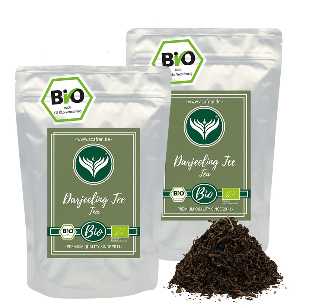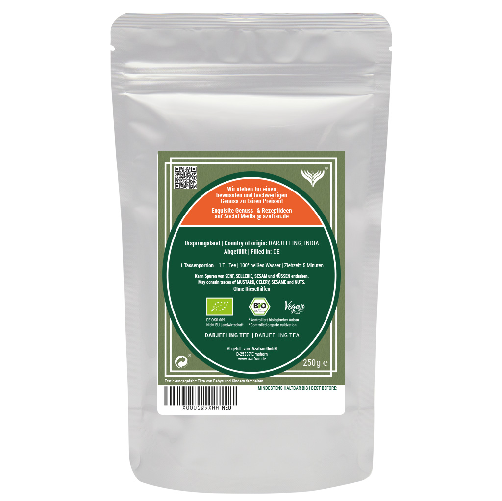 Bio Darjeeling schwarz im wiederverschließbaren Aromabeutel (à 250 Gramm) verpackt (Versandkostenfrei innerhalb von Deutschland geliefert).