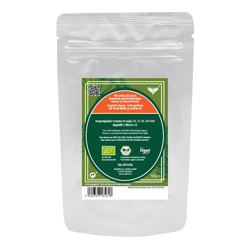 Dill im wiederverschließbaren Aromabeutel (à 50 Gramm) verpackt (Versandkostenfrei innerhalb von Deutschland geliefert).
