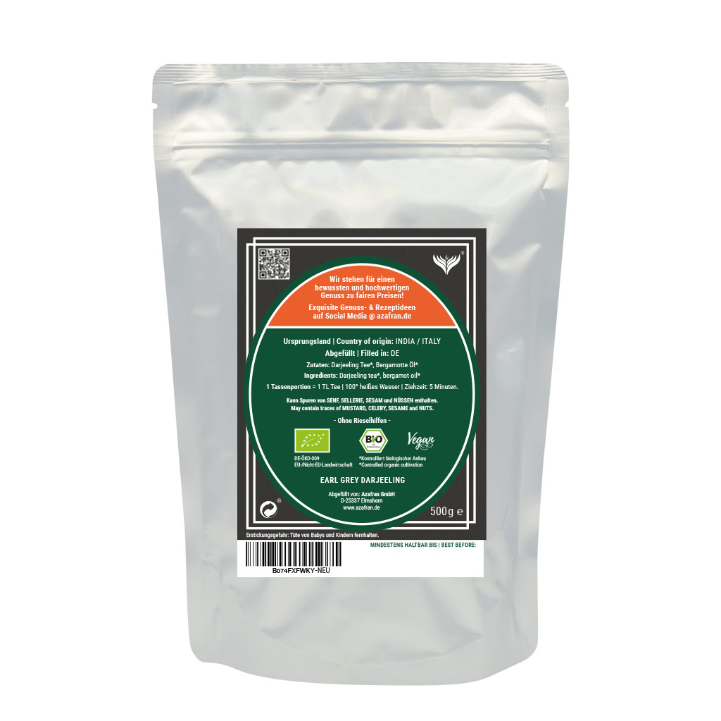 Bio Earl Grey (aus Darjeeling Tee schwarz) im wiederverschließbaren Aromabeutel (à 500 Gramm) verpackt (Versandkostenfrei innerhalb von Deutschland geliefert).