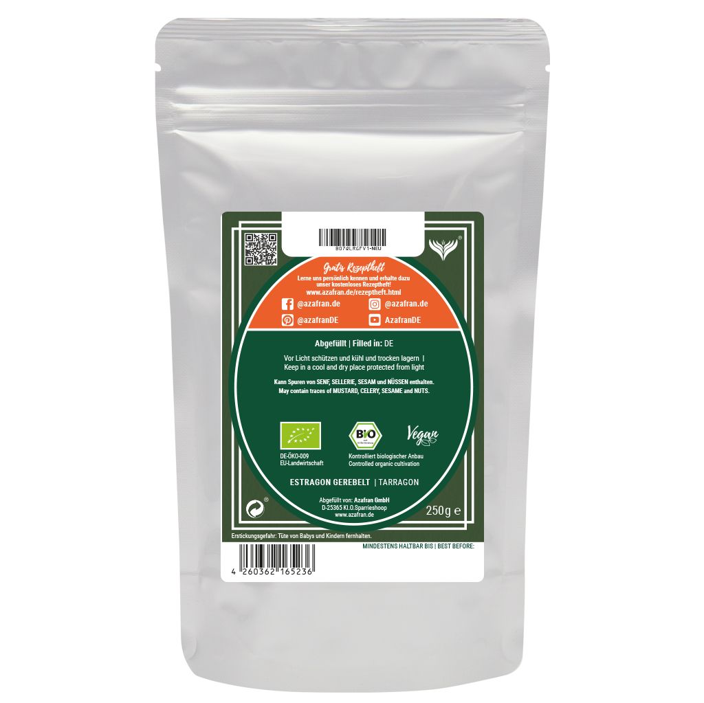 Unser Estragon stammt aus kontrolliert ökologischem Anbau in Deutschland. Es zeichnet sich durch seinen einzigartigen, aber auch charakteristischen Geschmack aus, was ihn vor allem in der französischen Küche sehr beliebt macht. Estragon verfeinert vielerlei Gerichte durch sein feinwürziges und kräftiges Aroma.