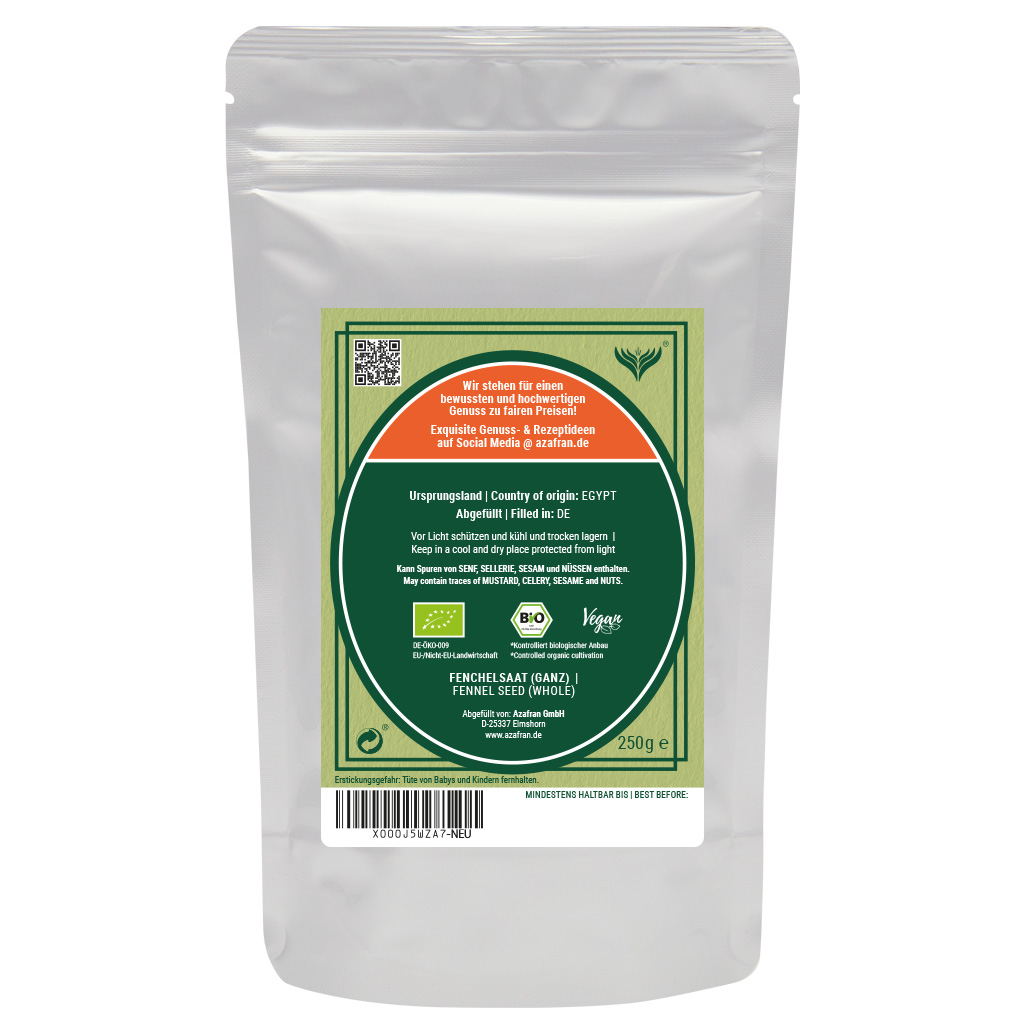 Unser BIO-Fenchel stammt aus kontrolliert biologischem Anbau in Ägypten. Er zeichnet sich durch seinen typisch süßen, aromatischen und anishaltigen Geschmack aus und ist eine gern verwendete Zutat in vielen indischen Gewürzmischungen.