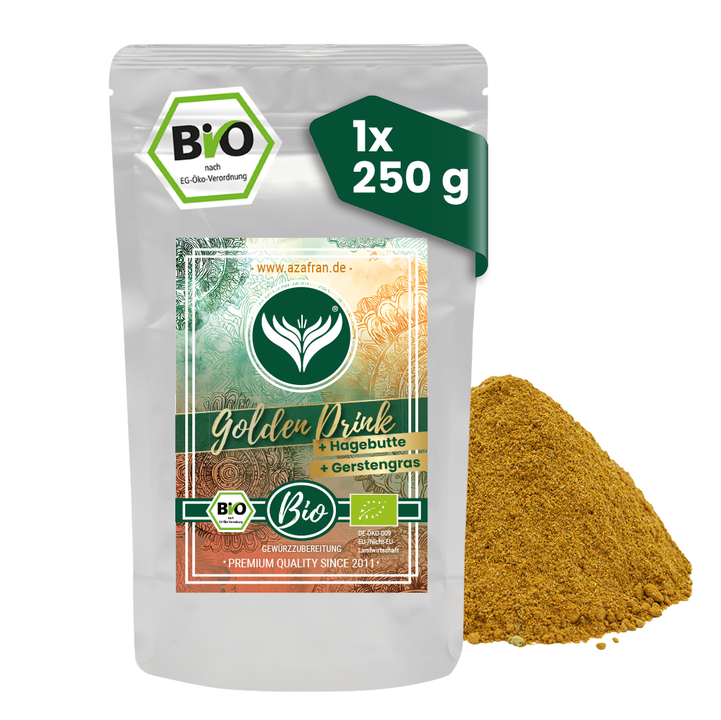 BIO Golden Drink+ bzw. Kurkuma Latte Gewürzzubereitung mit dem Plus an Gerstengras & Hagebutte für Sie zum günstigen Preis!