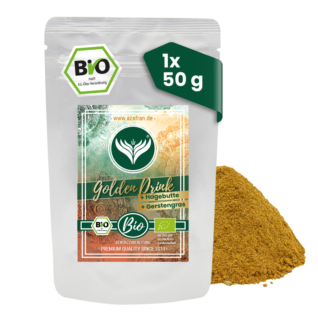 BIO Golden Drink+ bzw. Kurkuma Latte Gewürzzubereitung mit dem Plus an Gerstengras & Hagebutte für Sie zum günstigen Preis!