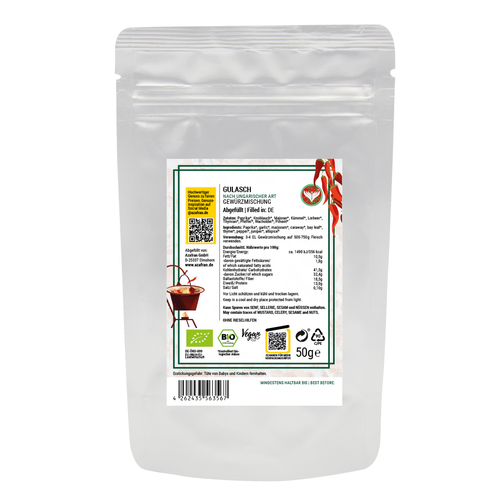BIO Gulasch Gewürzzubereitung im Aromabeutel (50g) verpackt, ideal für herzhafte Schmorgerichte und klassische Gulaschgerichte.