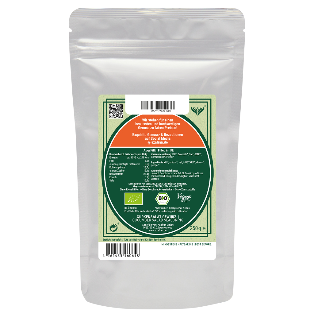 BIO Gurkensalat Gewürzzubereitung im Aromabeutel (à 250 Gramm) verpackt (Versandkostenfrei innerhalb von Deutschland geliefert).