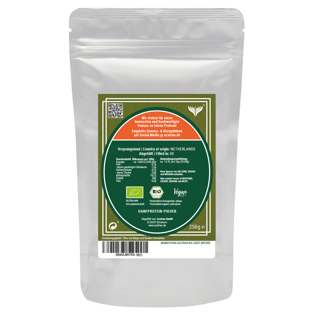 BIO Hanfproteinpulver im Aromabeutel (à 250 Gramm) verpackt (Versandkostenfrei innerhalb von Deutschland geliefert).