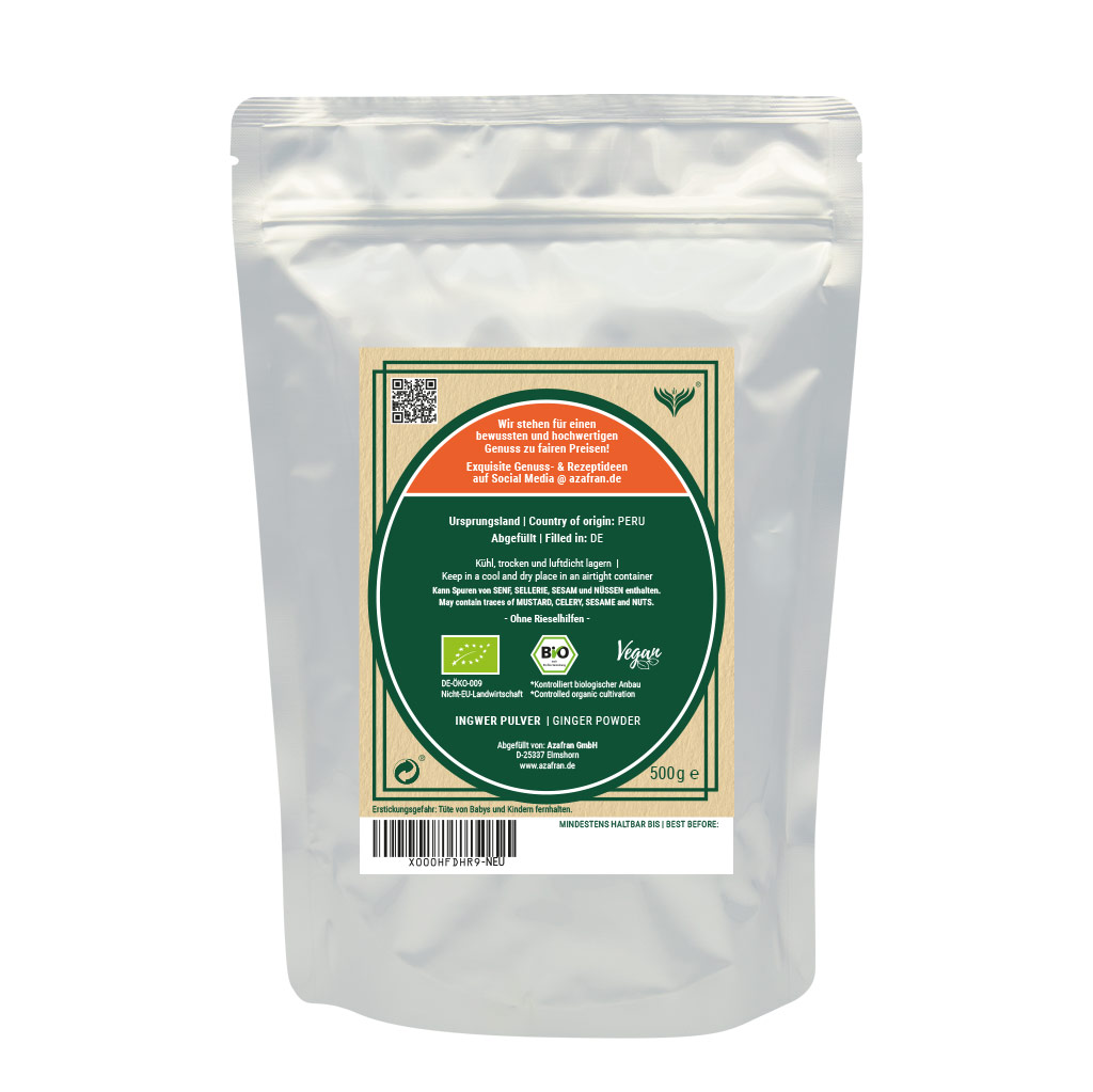 Ingwerwurzel gemahlen im wiederverschließbaren Aromabeutel (à 500 Gramm) verpackt (Versandkostenfrei innerhalb von Deutschland geliefert).