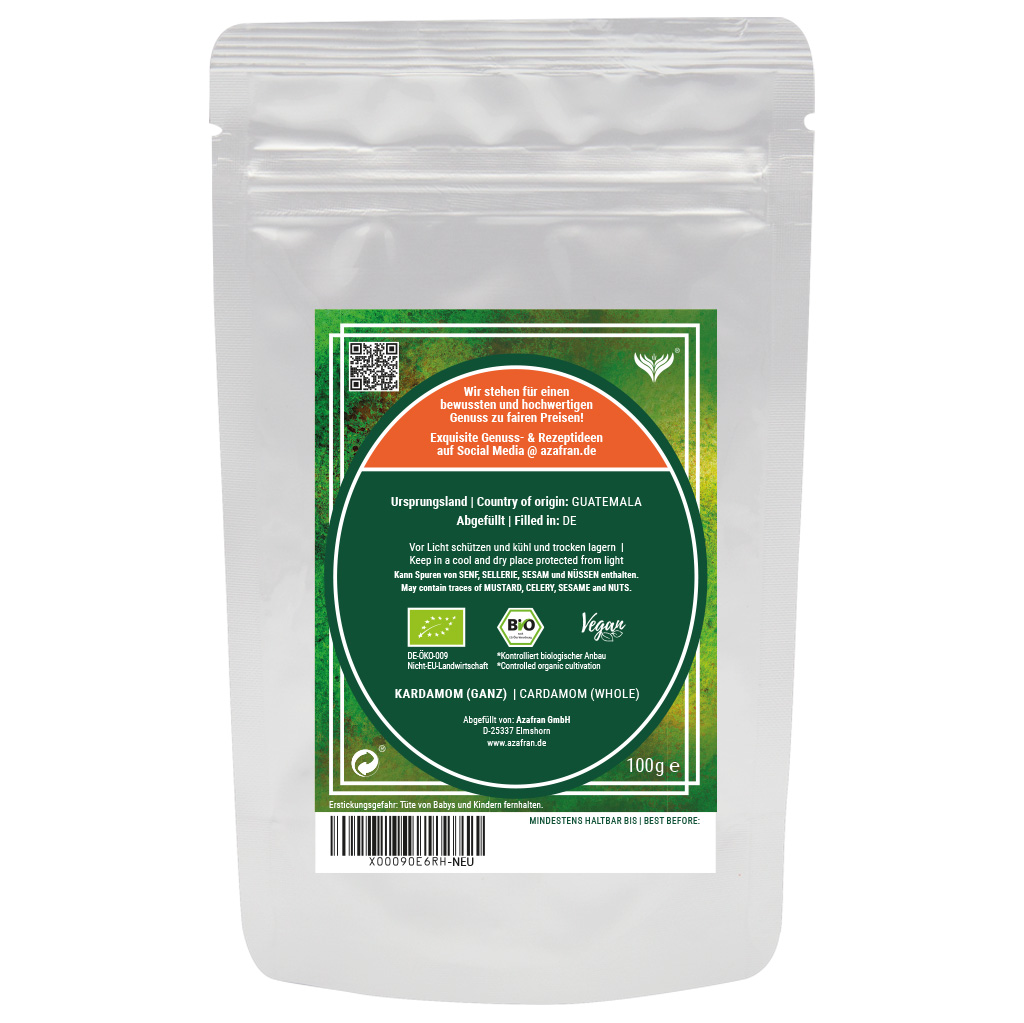 Ganze Kardamomkapseln, Premium Qualität im wiederverschließbaren Aromabeutel (à 100 Gramm) verpackt (Versandkostenfrei innerhalb von Deutschland geliefert).