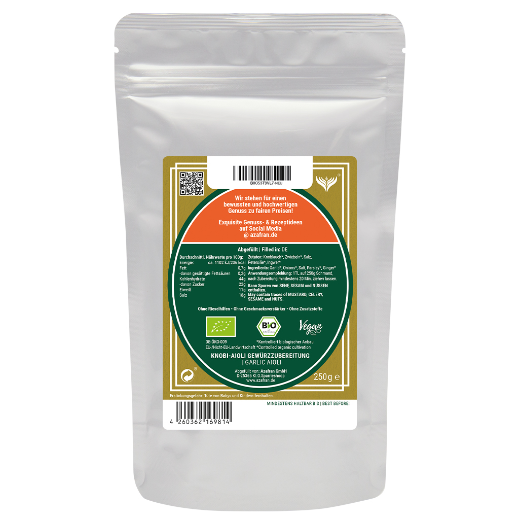 Bei unserem BIO Aioli Gewürz handelt es sich um eine typische Aioli Gewürzzubereitung aus hochwertigen BIO Zutaten mit einem kräftig-würzigen Aroma.