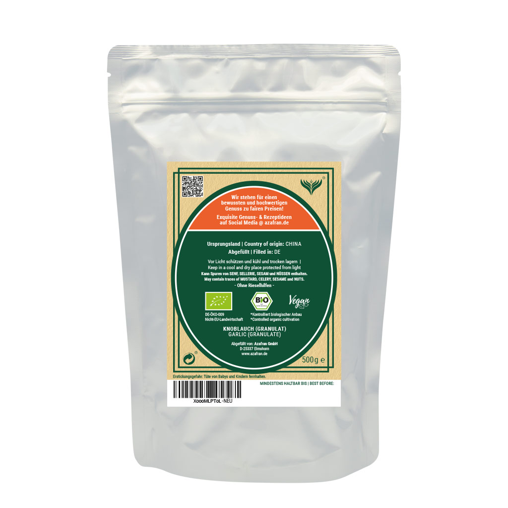 Knoblauchgranulat im wiederverschließbaren Aromabeutel (à 500 Gramm) verpackt (Versandkostenfrei innerhalb von Deutschland geliefert).