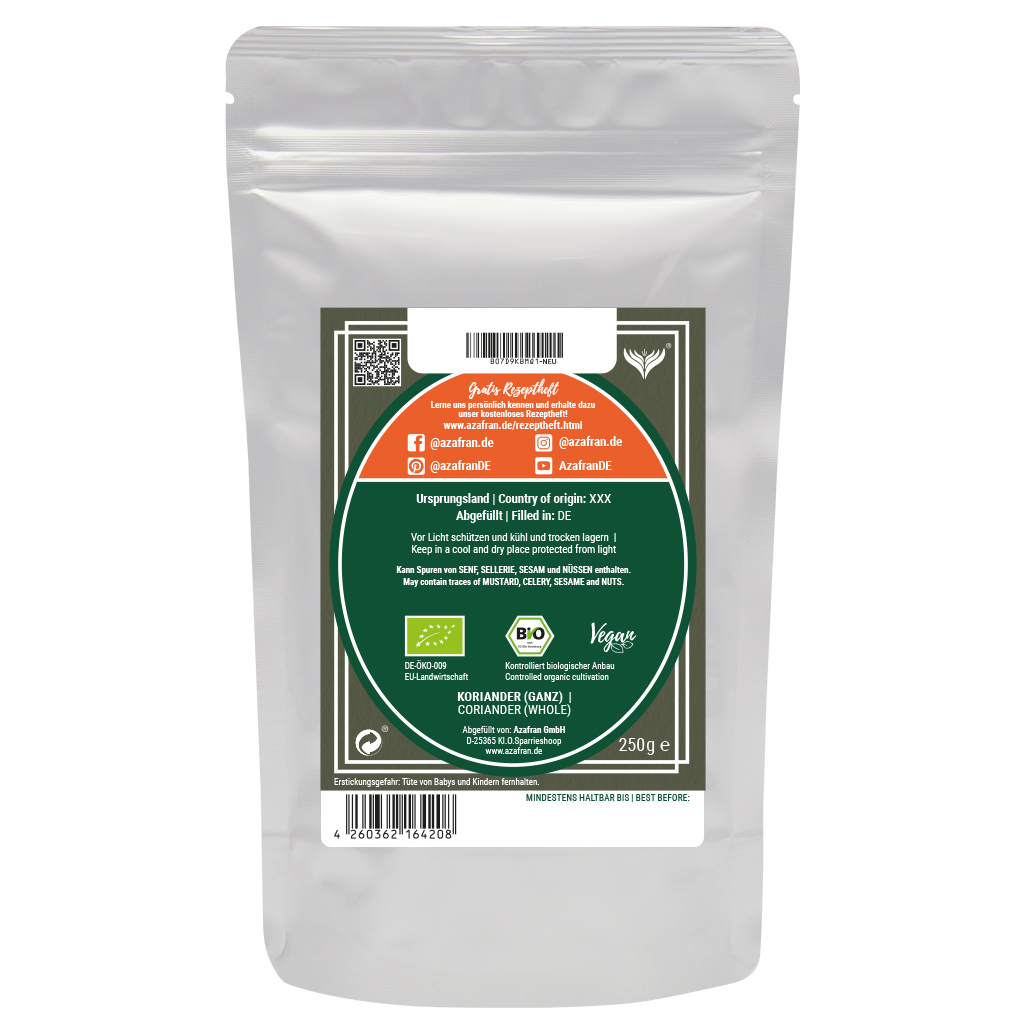 Unser Bio-Koriander stammt aus kontrolliert biologischen Anbau in Osteuropa. Er zeichnet sich durch sein herbwürziges Aroma mit süßem Nachgeschmack aus und ist ein typischer Bestandteil vieler asiatischer und indischer Gewürzmischungen und Speisen.
