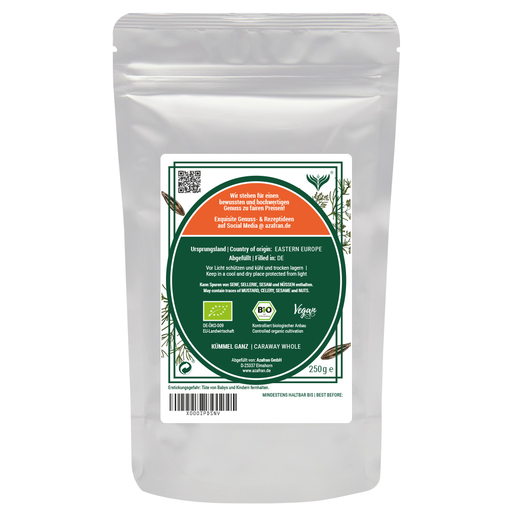 Kümmel ganz im wiederverschließbaren Aromabeutel (à 250 Gramm) verpackt (Versandkostenfrei innerhalb von Deutschland geliefert).