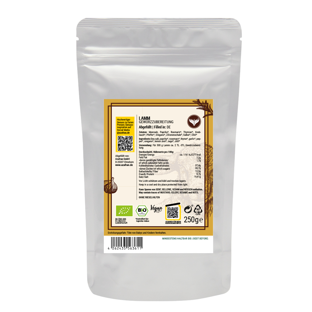 BIO Lamm Gewürzzubereitung im Aromabeutel (à 250 Gramm) verpackt (Versandkostenfrei innerhalb von Deutschland geliefert).