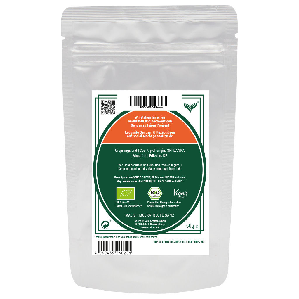 Macis ganz im wiederverschließbaren Aromabeutel (à 50g) verpackt (Versandkostenfrei innerhalb von Deutschland geliefert).