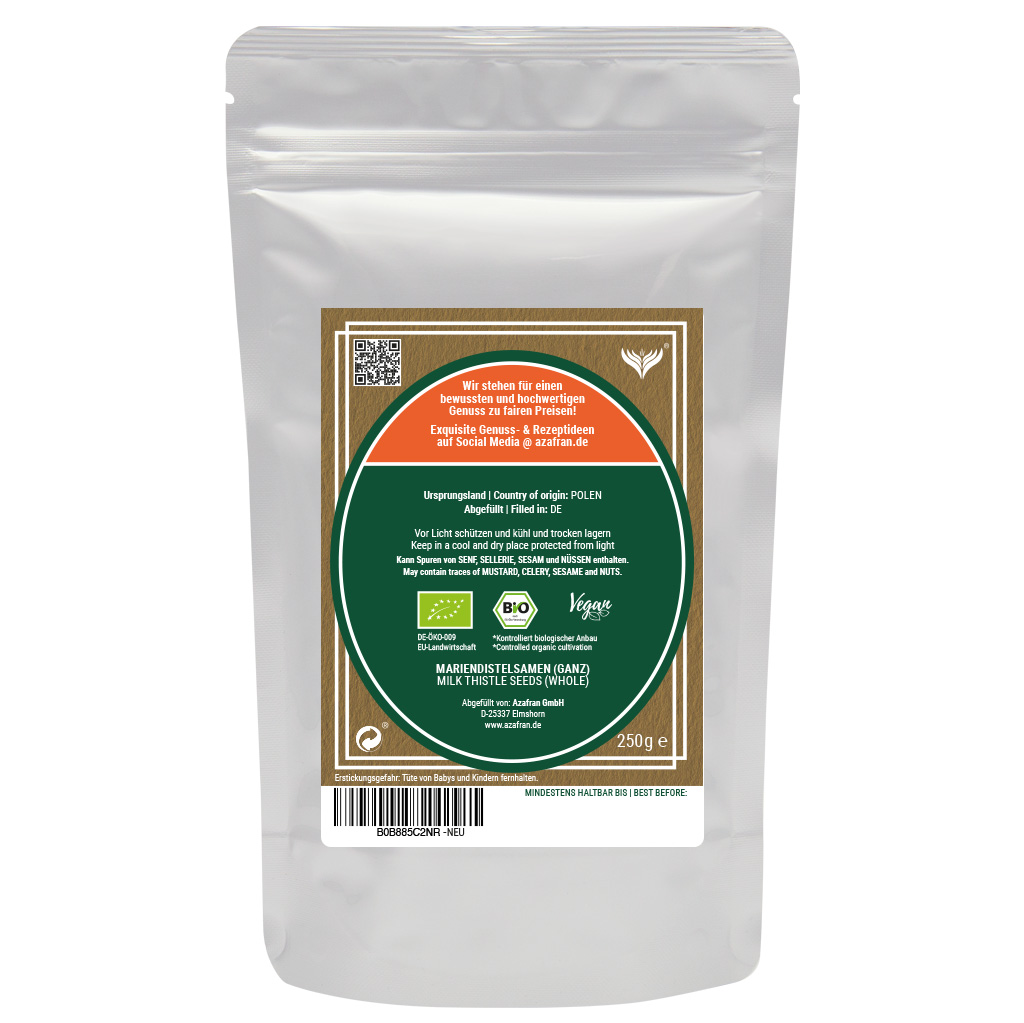Unsere BIO Mariendistelsamen sind zu 100% natürlich und ohne Konservierungs- und Zusatzstoffe. Selbstverständlich achten wir auch bei den Mariendistelsamen auf eine sehr hohe Qualität, um Ihnen das von Azafran gewohnte und sehr gute Preis-Leistungs-Verhältnis anbieten zu können.