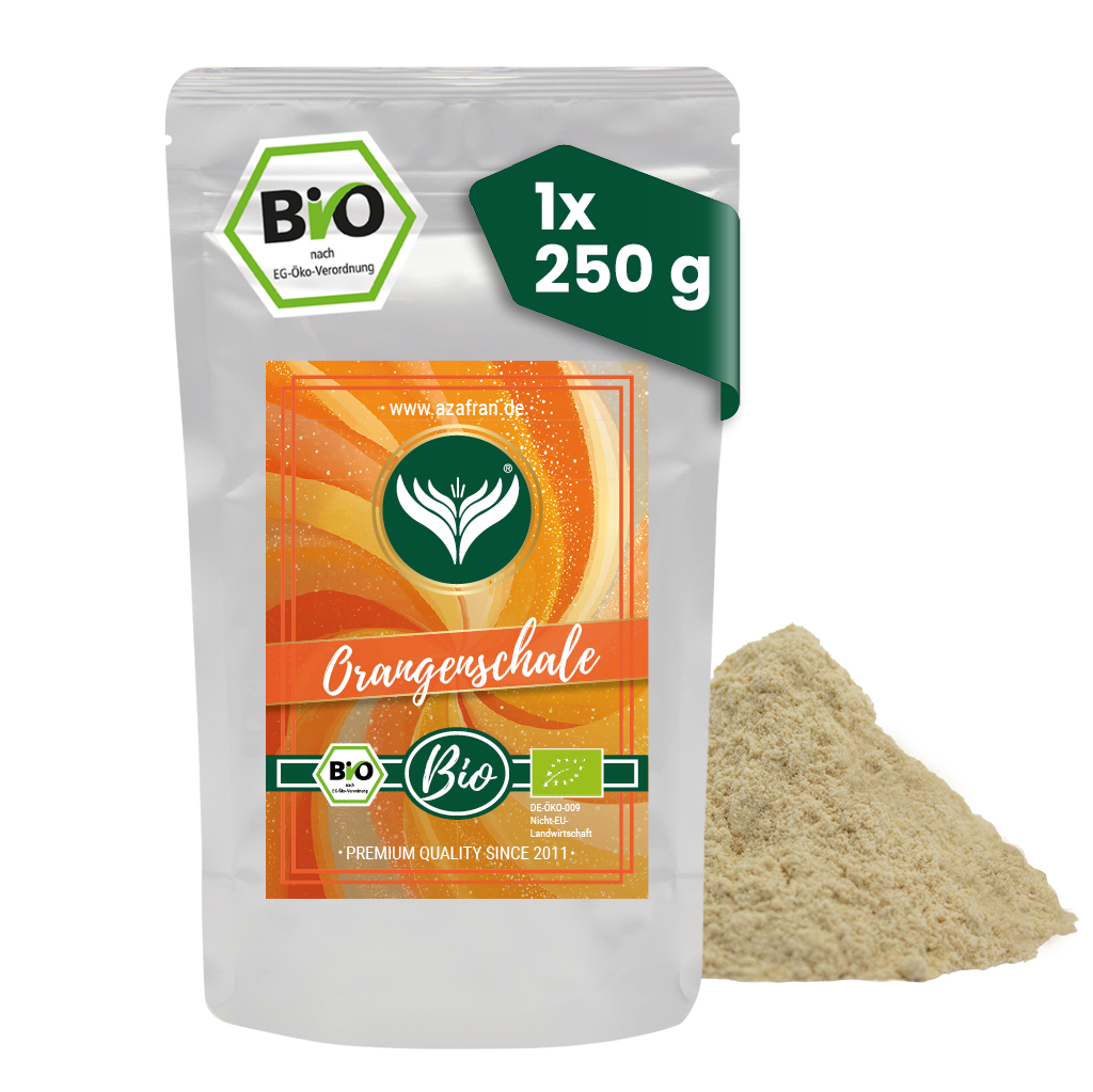 BIO Orangenschale gemahlen im wiederverschließbaren Aromabeutel (à 250 Gramm) verpackt (versandkostenfrei innerhalb von Deutschland geliefert).