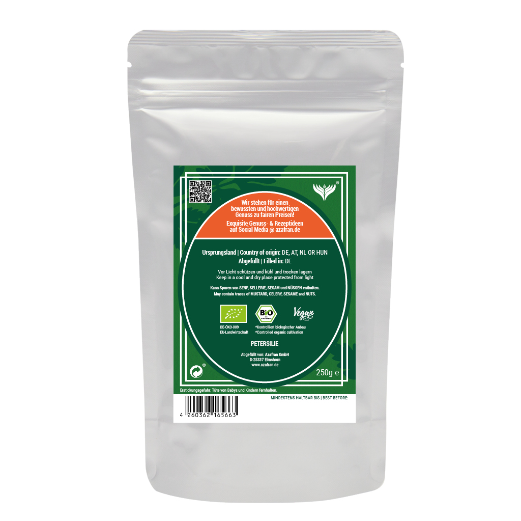 Unsere Petersilie stammt aus kontrolliert ökologischem Anbau in Deutschland, Österreich, Ungarn oder Holland. Sie zeichnet sich durch einen harmonischen würzig leicht herben Geschmack aus, was fast all Ihren Gerichten eine besondere Note verleihen wird.