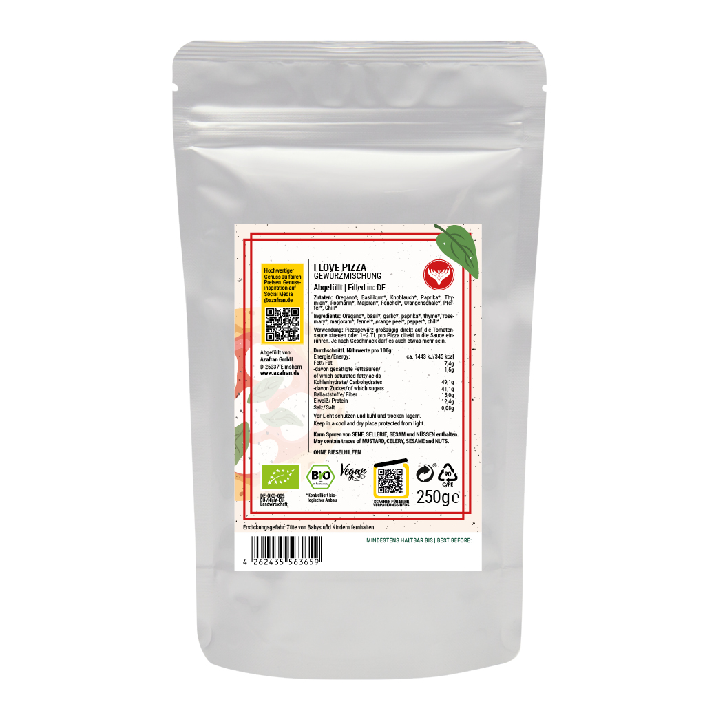 BIO Pizza Gewürz „I Love Pizza“ im Aromabeutel (250g) verpackt, ideal für Pizza, Pasta, Tomatensauce & mediterrane Küche.