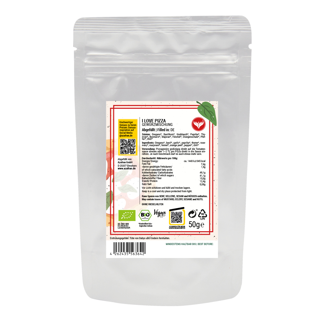 BIO Pizza Gewürz „I Love Pizza“ im Aromabeutel (50g) verpackt, ideal für Pizza, Pasta, Tomatensauce & mediterrane Küche.
