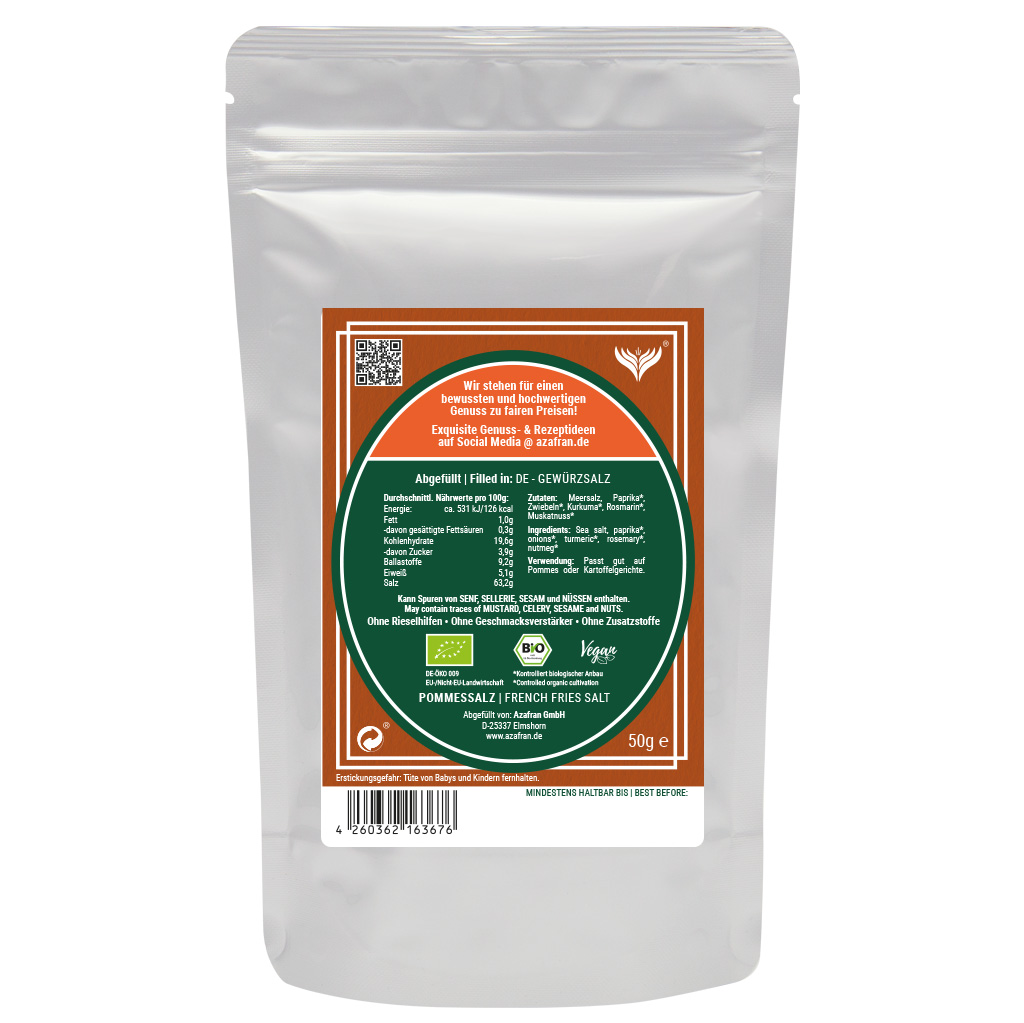 BIO Pommessalz bzw. Kartoffel Gewürzsalz im Aromabeutel (à 50 Gramm) verpackt (Versandkostenfrei innerhalb von Deutschland geliefert).