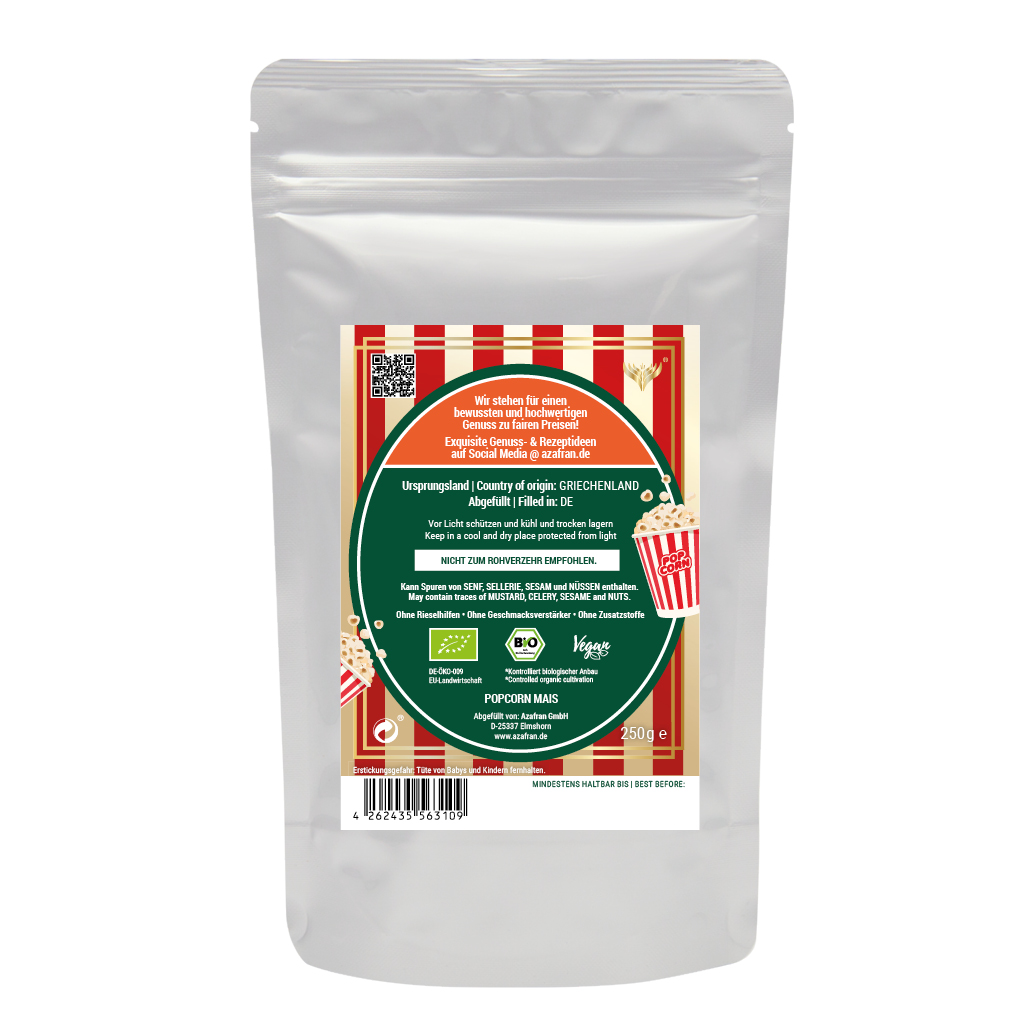 Azafran BIO Popcornmais im Aromabeutel (à 250 Gramm) verpackt (versandkostenfrei innerhalb von Deutschland geliefert).