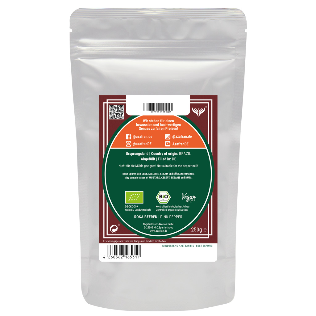 Bio Rosa Beeren im wiederverschließbaren Aromabeutel (à 250 Gramm) verpackt (Versandkostenfrei innerhalb von Deutschland geliefert).