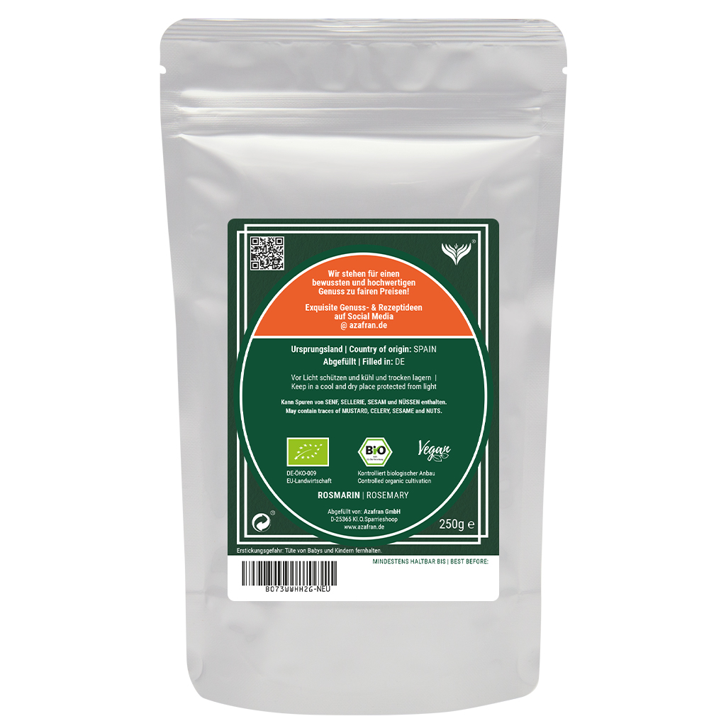 Unser Rosmarin stammt aus kontrolliert ökologischem Anbau in Spanien. Er zeichnet sich durch seinen leicht herben/harzigen sowie frisch-würzigen, aber auch eigenen typischen Rosmarin-Geschmack aus, was ihn z.B. in der mediterranen Küche sehr beliebt macht.
