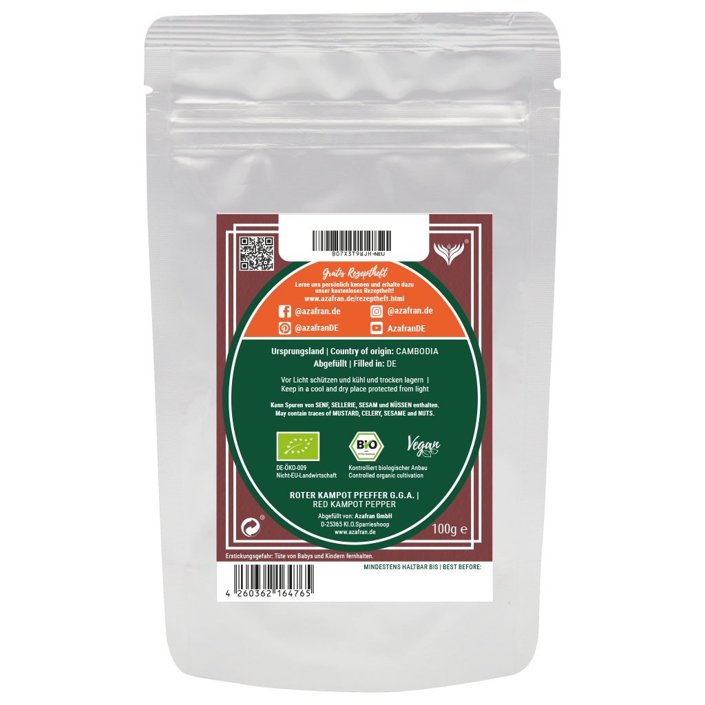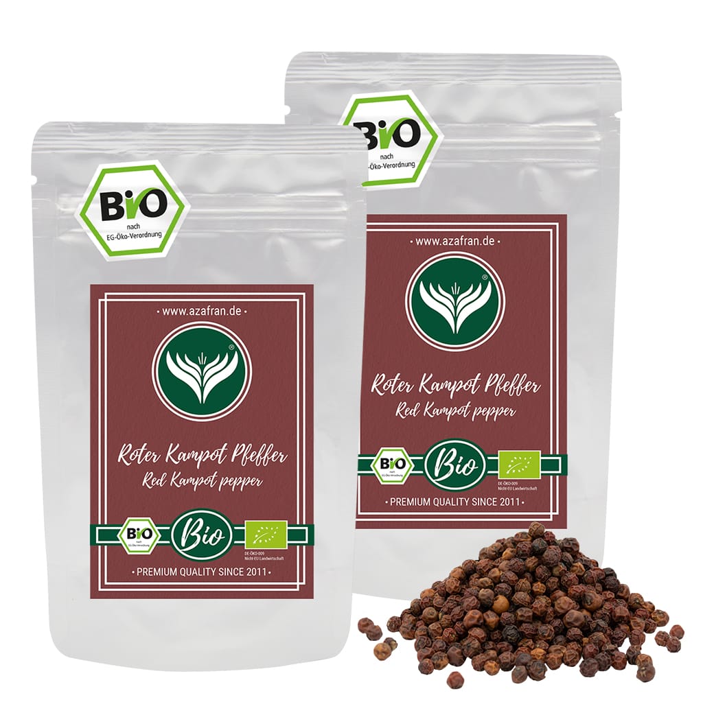 Der BIO Kampot Pfeffer stammt aus kontrolliertem biologischen Anbau in Kambodscha. Dieser Rote Pfeffer ist eine wahre Rarität und überzeugt durch sein fruchtiges Aroma und seine besondere Schärfe.
