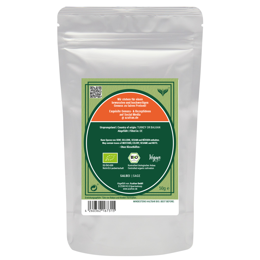 Salbei im wiederverschließbaren Aromabeutel (50 Gramm) verpackt (Versandkostenfrei innerhalb von Deutschland geliefert).