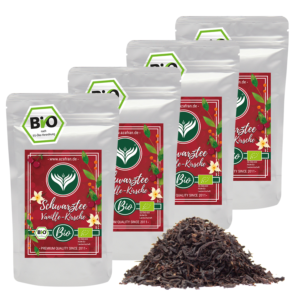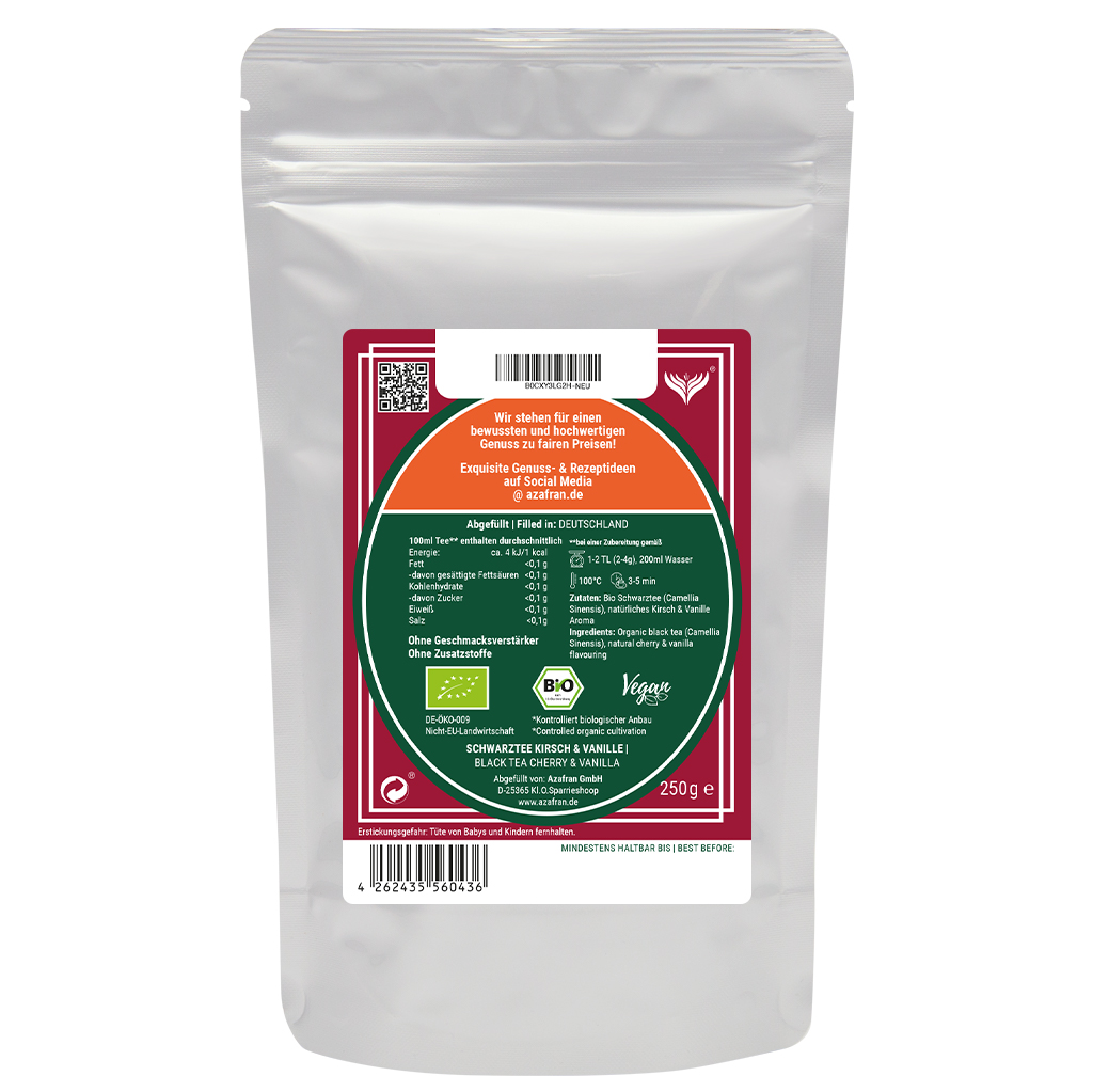Bio Schwarztee Vanille Kirsche im wiederverschließbaren Aromabeutel (à 250 Gramm) verpackt (Versandkostenfrei innerhalb von Deutschland geliefert).