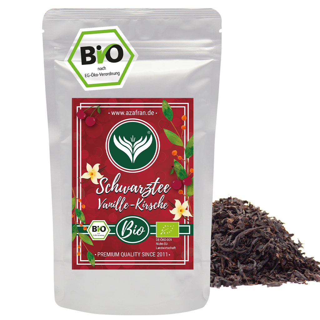 Bio Schwarztee Vanille Kirsche im wiederverschließbaren Aromabeutel (à 250 Gramm) verpackt (Versandkostenfrei innerhalb von Deutschland geliefert).