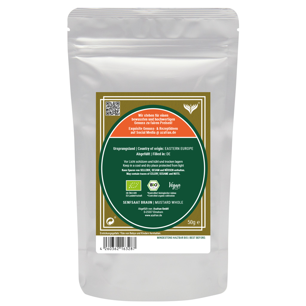 Senfsaat im wiederverschließbaren Aromabeutel (à 50 Gramm) verpackt (Versandkostenfrei innerhalb von Deutschland geliefert).