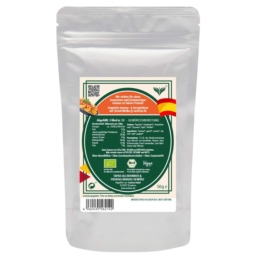 Entdecken Sie die BIO Tapas Allrounder / Patatas Bravas Gewürzzubereitung von Azafran – der perfekte Begleiter für Ihre spanische Küche! Unsere hochwertige Mischung besteht aus biologischen Zutaten und vereint die authentischen Aromen Spaniens in einer perfekten Balance. Ideal für die beliebten Patatas Bravas, knusprige Kartoffelwürfel mit würziger Sauce, eignet sich diese Mischung auch hervorragend für zahlreiche weitere Tapas Gerichte sowie Saucen, Dips, Fleisch, Fisch, Gemüse und Pasta.