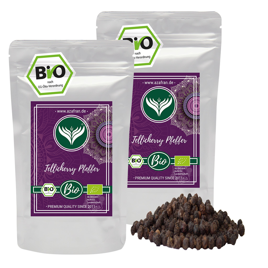 Bio Tellicherry Pfeffer (Tellicherry Pepper), ganz – der König der Gewürze! Kaufen Sie Tellicherry Pfeffer lose günstig nach dem Prinzip „Geld sparen durch Großpackungen“ ein. Entdecken Sie die exquisite Welt des Bio Tellicherry Pfeffers. Dieser edle Pfeffer stammt aus der renommierten Tellicherry-Region an der Westküste Indiens und gilt als einer der besten Pfeffersorten der Welt. Mit seinem intensiven Aroma und der einzigartigen Schärfe verleiht er Ihren Gerichten eine unvergleichliche Note und ist ein Muss für jeden Genussliebhaber.