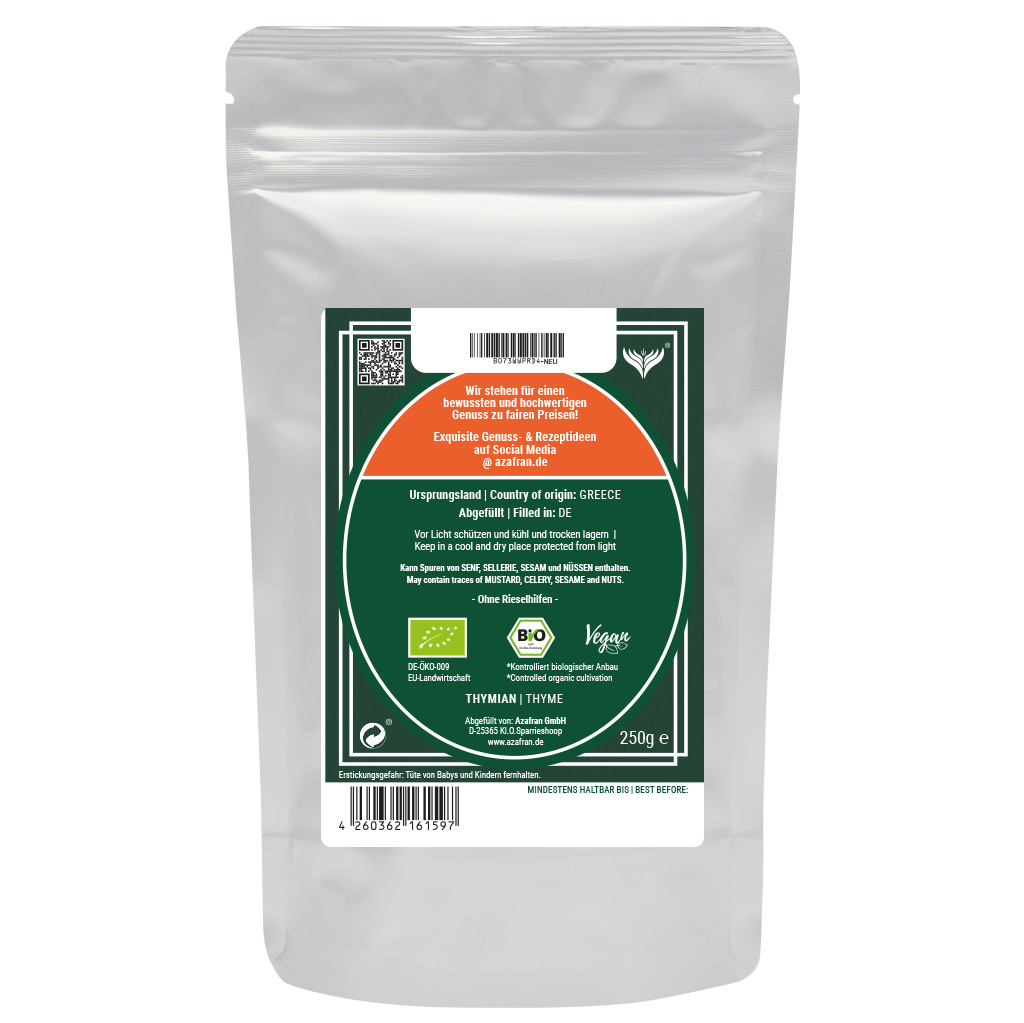 Thymian im wiederverschließbaren Aromabeutel (à 250 Gramm) verpackt (Versandkostenfrei innerhalb von Deutschland geliefert).