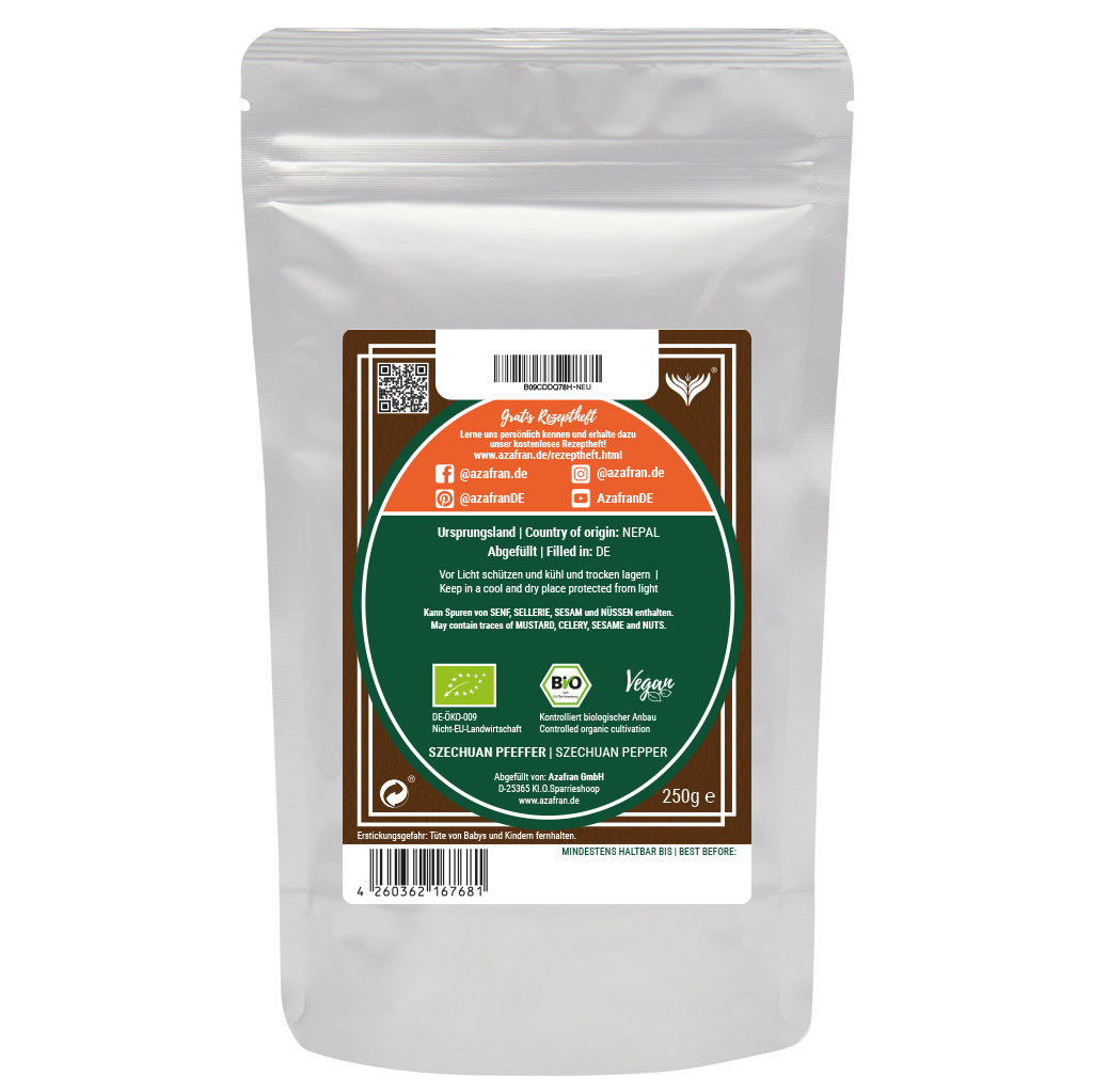 Dieses Gewürz wird Ihre Speisen kulinarisch bereichern, da es die "Taubheitsrezeptoren" auf der Zunge anspricht und Ihnen dadurch ein faszinierendes Gefühl beim Genuss Ihrer Speisen ermöglicht. Verfeinern Sie beispielsweise asiatische Gerichte, helles Fleisch, Fisch oder auch Früchte sowie viele Desserts mit diesem hochwertigen Gewürz.