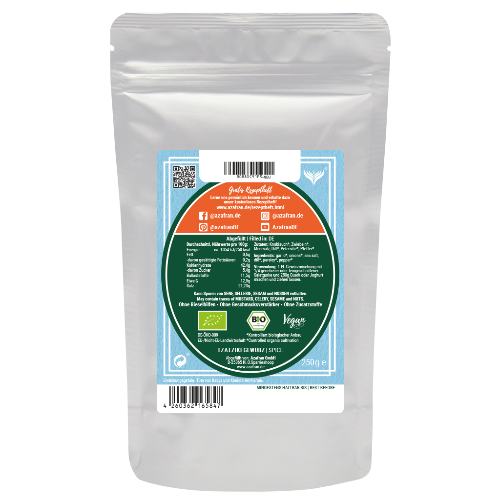 BIO Tzatziki Gewürzzubereitung im Aromabeutel (à 250 Gramm) verpackt (Versandkostenfrei innerhalb von Deutschland geliefert).